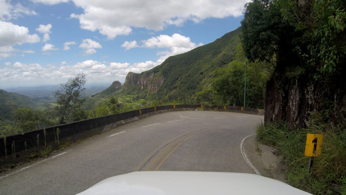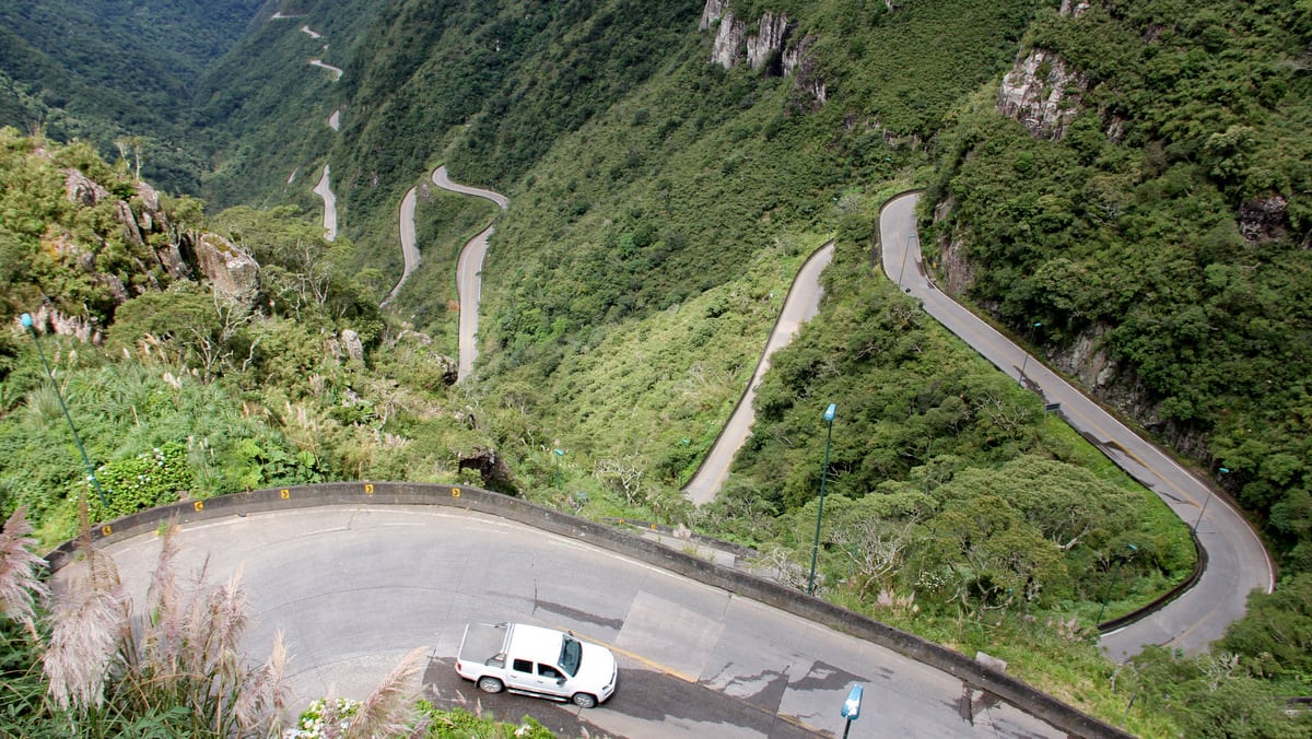 Começamos a descida e, a cada curva que se descortinava, parávamos nos acostamentos para fotografar, observar as paisagens deslumbrantes e também para esperar os caminhões realizarem as manobras. Ficamos pensando o quanto não deve ser fácil pilotar um caminhão nesta serra, já que muitos deles precisam ocupar as duas pistas para realizarem algumas curvas. Todo cuidado é pouco, já que se anda ao lado de precipícios a todo momento.