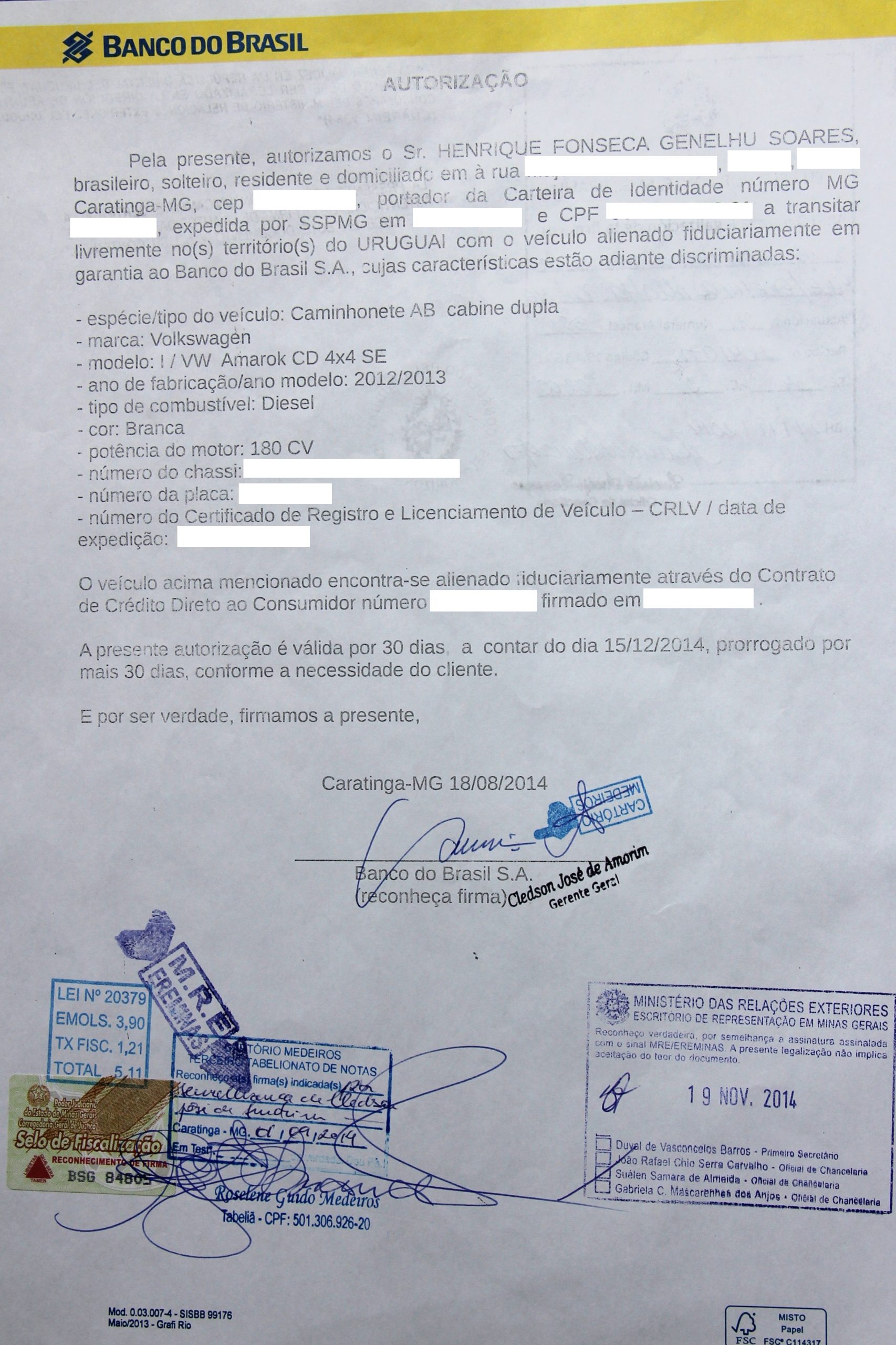 Se o carro estivesse em nome de outra pessoa ou empresa, o procedimento é o mesmo. Você pode utilizar o modelo do Banco do Brasil para escrever a autorização e depois autenticá-la e apostilar no cartório.