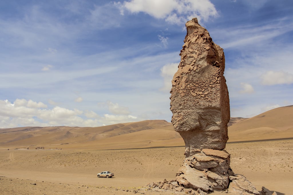 Tivemos que usar a tração várias vezes, pois ficamos atolados em alguns lugares. Caso esteja em um carro não tracionado, a melhor alternativa é deixá-lo na entrada do parque e caminhar por entre os Monjes. Mesmo que não consiga chegar até o Salar a pé, a visita já valerá e muito a pena. Para nós, os Monjes são um dos cenários mais incríveis do deserto. Pela distância da cidade e altitude, é melhor fazer este passeio, também, pela manhã.