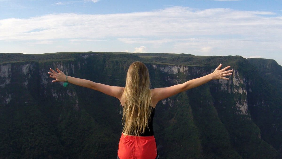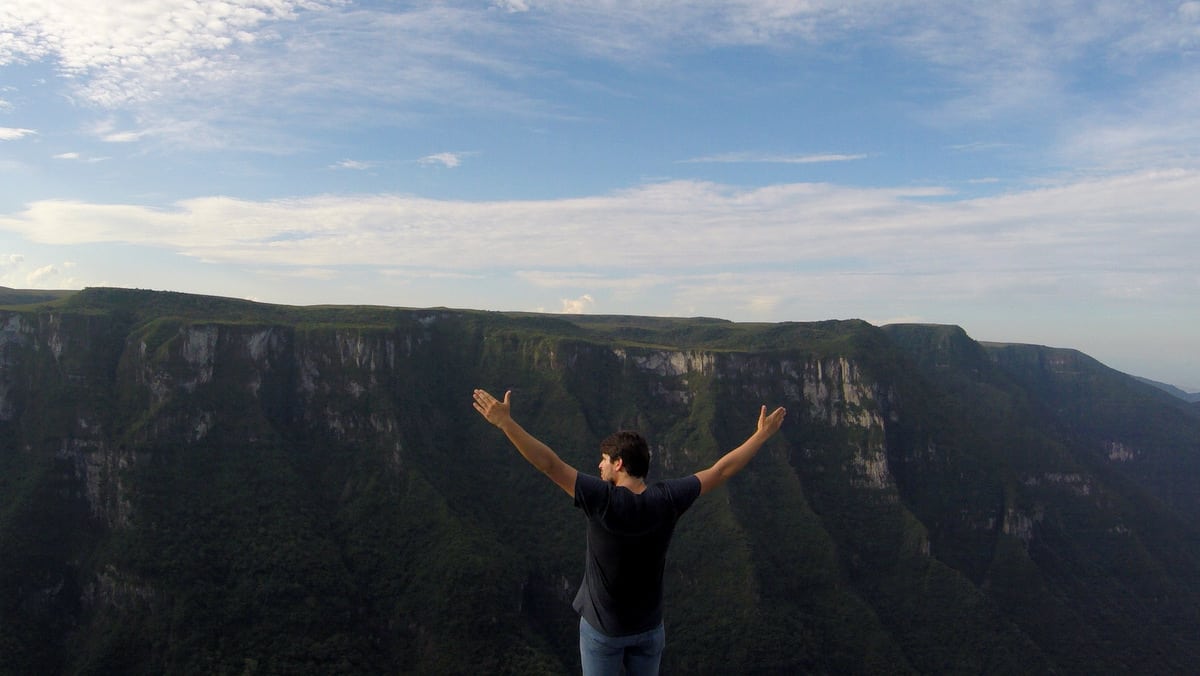 Após alguns quilômetros por estradas de chão, chegamos à entrada do parque. O acesso ao Cânion Fortaleza é gratuito e o estacionamento fica ao lado de sua cratera, algo que só fomos perceber do alto, quando estávamos às bordas do cânion. Paramos o carro e começamos a trilha, bem fácil e que leva poucos minutos. Logo no começo, já pudemos avistar a imensidão do Fortaleza e as inúmeras cachoeiras que brotam das rochas. Contudo, foi somente quando atingimos o ponto mais alto do mirante, que conseguimos entender o seu nome. O Cânion Fortaleza, de paredões que ultrapassam os 1.000 metros de altura, lembra as antigas fortalezas que eram construídas para se proteger dos inimigos, só que dezenas de vezes maior que qualquer muro já construído pelo homem.