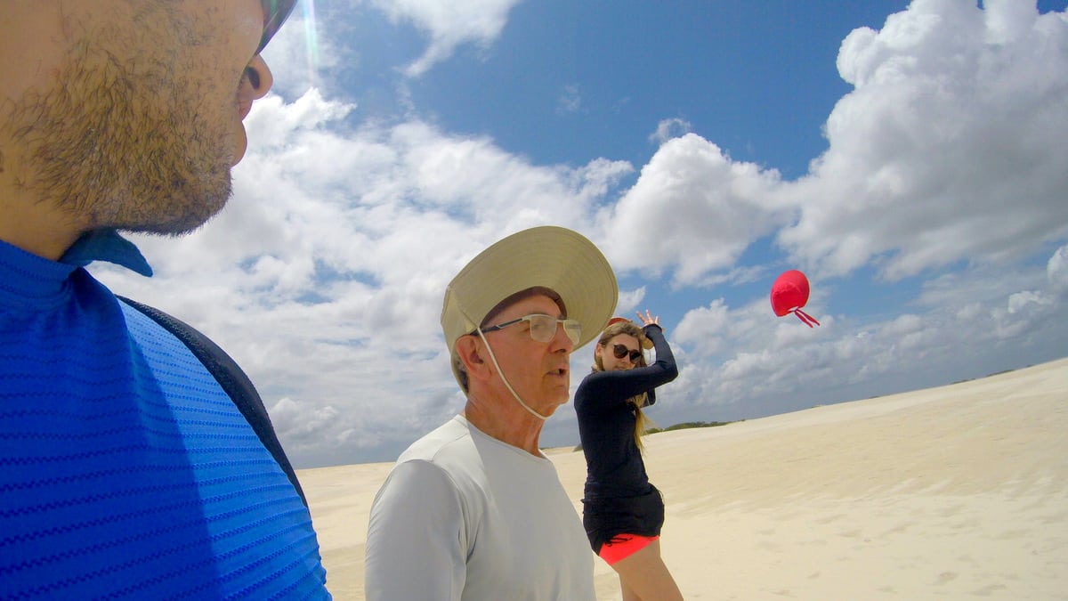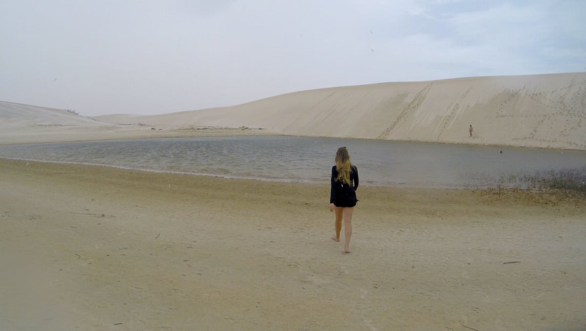 O sol nos dava uma trégua neste dia, mesmo assim a areia estava muito quente e o calor, literalmente, de deserto. Colocamos a mochila nas costas com muita água e protetor solar e partimos. Pelo caminho, o guia local que nos acompanhava nos mostrava os lugares onde, na época da cheia, se formam as lagoas. Imaginamos o quão belo devem ser os Lençóis e suas incríveis lagoas de águas azuis e esverdeadas. Por outro lado, somente na época da seca que se “forma” o imenso deserto de dunas, a perder de vista.
