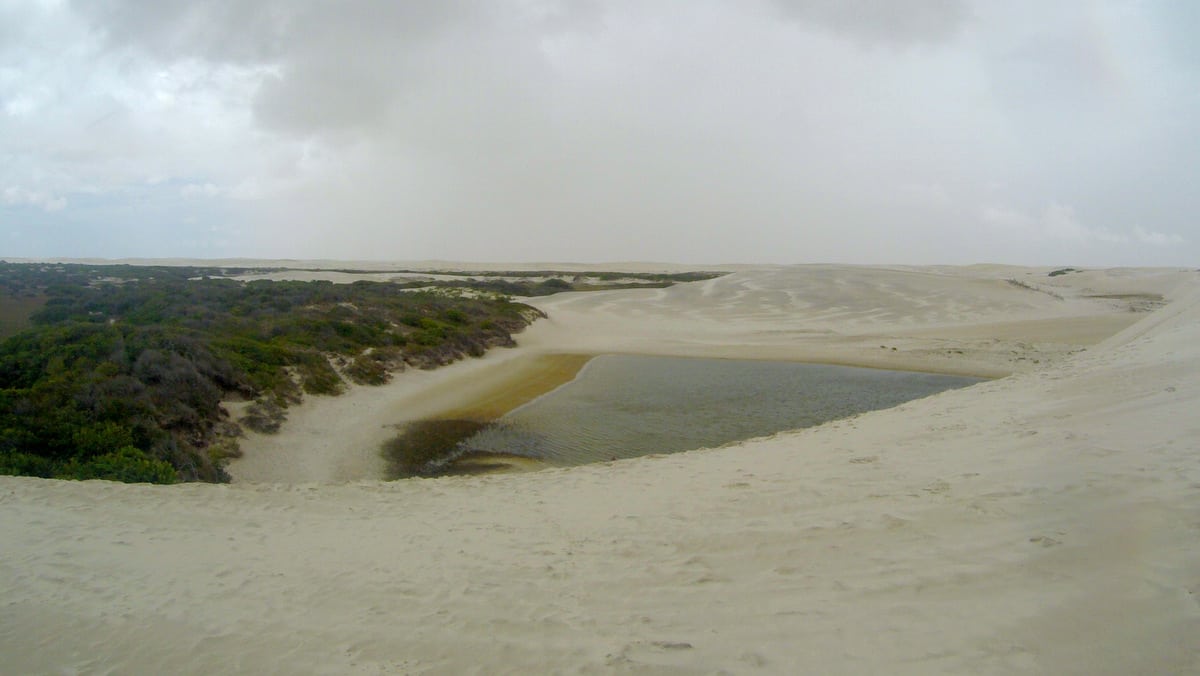 Balança daqui, balança dali, abaixa a cabeça para não ser surpreendido por nenhum galho de árvore e, após uns 40 minutos por lindas estradas de areia em meio à vegetação característica do Parque, chegamos ao ponto inicial das dunas, de onde abandonaríamos o carro e seguiríamos a pé até a Lagoa do Peixe, a única que segundo relatos estaria com água.