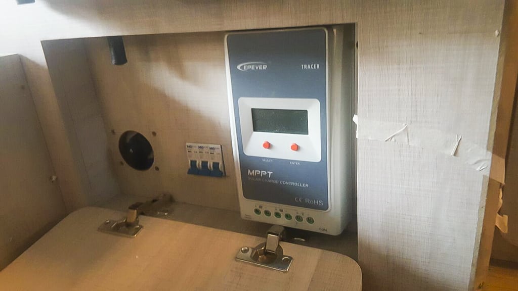 Para atingir a nossa auto-suficiência energética, usamos duas baterias estacionárias de 105ah, que são abastecidas frequentemente de duas formas: 1) As baterias são interligadas ao sistema de partida do carro. Toda vez que ligamos e rodamos com o Mochileiro, as baterias são automaticamente recarregadas. Mas, e se ficarmos por vários dias estacionados, sem acionar o carro? É aí que entra a segunda forma de geração de energia: 2) Neste caso, são os dois painéis solares Yingli de 95Wp que produzem energia para as baterias da casa. Por meio de um controlador de carga MPPT, que são os mais eficientes, a energia solar é convertida em energia elétrica e, posteriormente, transformada em 12v, mantendo nossos equipamentos em pleno funcionamento.