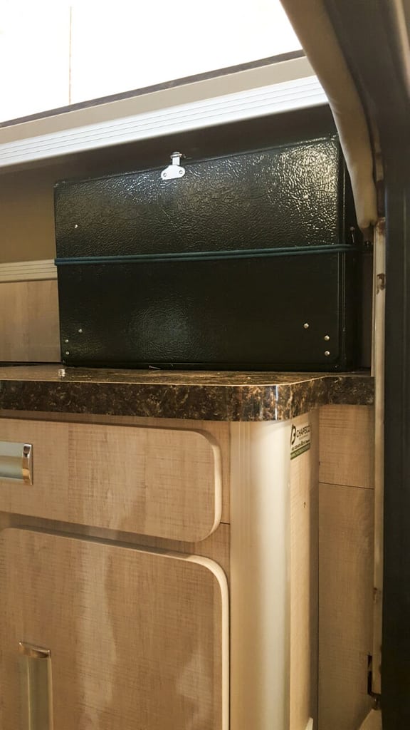 Já o nosso banheiro, por enquanto, é no improviso. Estamos com ideia de instalar um porta potti, contudo o nosso espaço está muito limitado. Tentaremos comprar um menor pelo caminho.