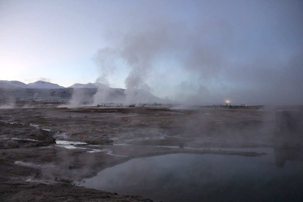 Chegamos aos Gêiseres e o dia ainda estava escuro, mas as águas borbulhantes já começavam a dar as caras. Não conhecíamos ainda estas águas termais, e nos encantamos com suas erupções e com a quantidade de vapor que sai das crateras. Quando for visitar o El Tatio, saia de San Pedro bem cedo e, desta forma, conseguirá desfrutá-lo quase a sós. Não se esqueça de colocar suas roupas mais quentes e térmicas, pois, antes do amanhecer, as temperaturas sempre ficam abaixo de zero. Pegamos -7˚Celsius quando chegamos. Mesmo assim, este é mais um espetáculo do Atacama.