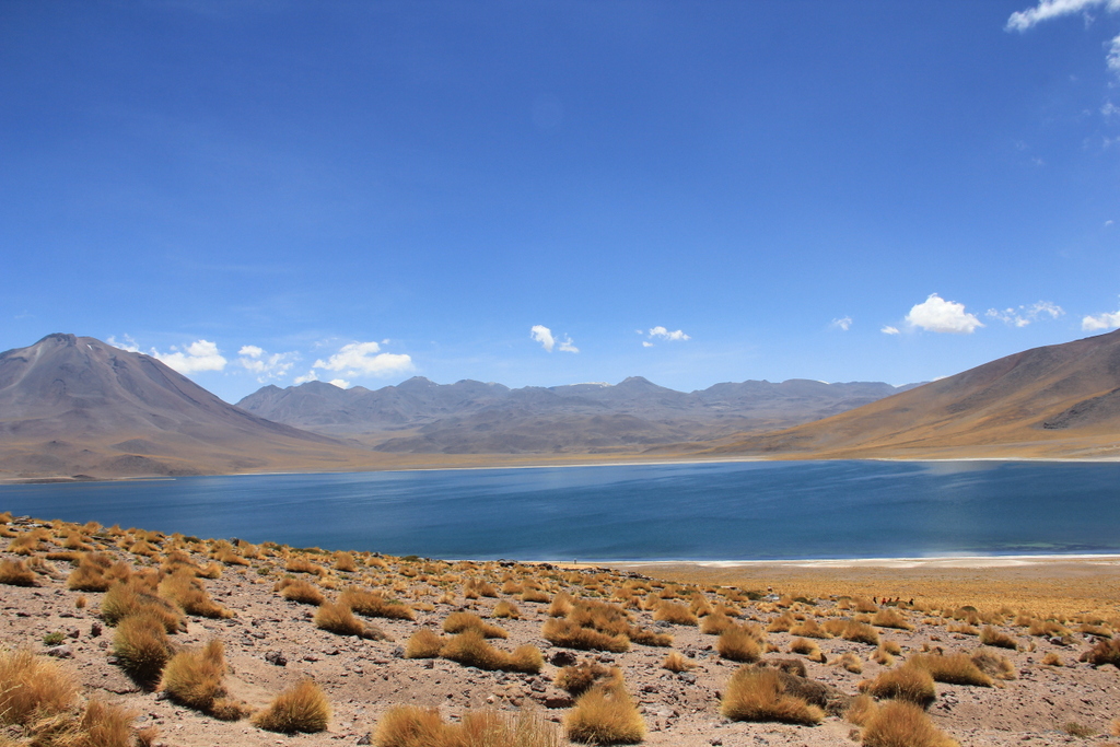 Ainda estávamos em êxtase, quando partimos rumo às Lagunas Altiplânicas, Miscanti e Miñiques. Este oásis se localiza na chamada “La Puna”, altiplanos do deserto com vegetação rasteira e de linda coloração amarelada. Estas lagunas, situadas a mais de 4.200 metros de altitude, são um dos cartões-postais do Atacama. A primeira visão que se tem das lagunas, quando ainda se está no carro, é algo inacreditável. As suas águas azuladas espelhando os vulcões e montanhas que as rodeiam completam o cenário. Ainda que se perca o fôlego caminhando entre as lagunas, devido à altitude, a visita vale todo o esforço. Deve ter sido inesquecível, para os primeiros povos que habitaram a região, a cerca de 10 mil anos atrás, os chamados Atacamenhos, descobrir este lugar. Não conseguíamos imaginar qual o primeiro sentimento que eles experimentaram ao pisar neste paraíso.