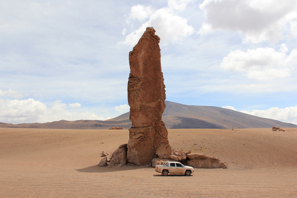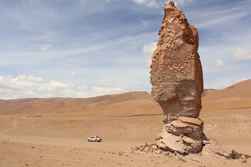 Na verdade, apesar do pouco tempo que passamos em San Pedro, percebemos o quanto as informações sobre os pontos turísticos são desencontradas e que existe (de fato existe, sim) pouco interesse por parte da cidade em informar os visitantes, forçando-os a comprarem pacotes com as agências locais. Mesmo com todos estes obstáculos, não tínhamos dúvida: este foi o encontro inesperado mais especial de nossa viagem. Cruzamos a terra fofa do salar e nos aproximamos dos famosos Monjes de la Pacana, rochas de origem vulcânica que, dispostas do jeito que estão, nos fazem sentir em outro planeta. Para nós, do Terra Adentro, é a paisagem mais extraterrestre do deserto e um dos lugares mais surpreendentes do continente sul-americano.