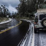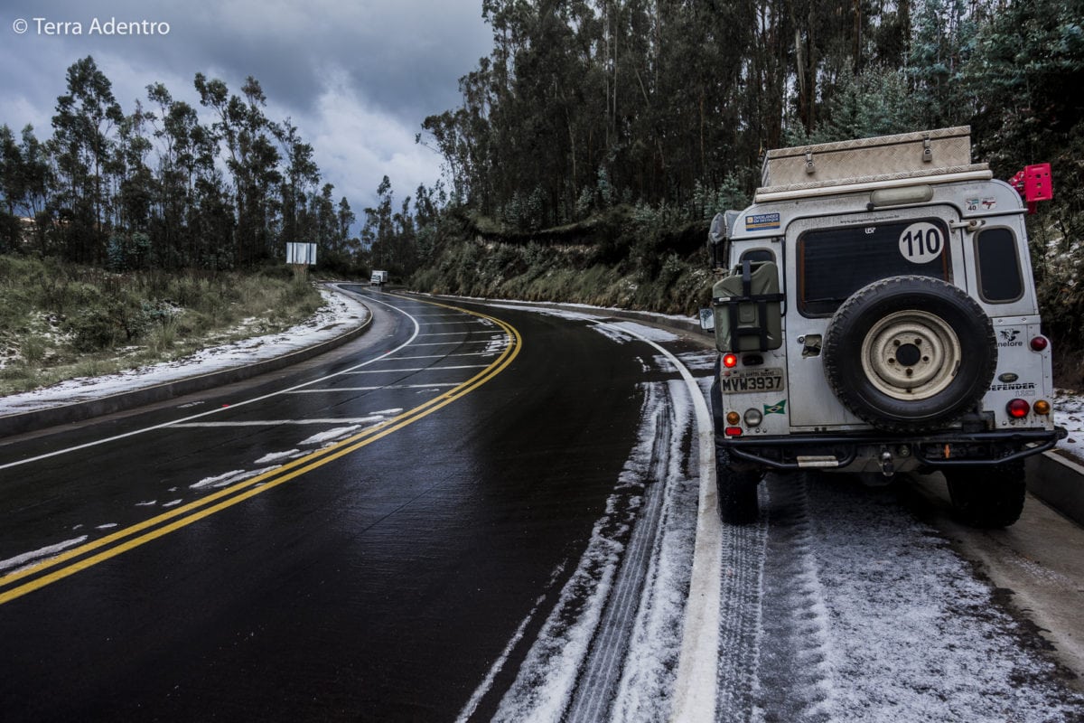 Contudo, nos primeiros quilômetros de Hemisfério Norte, a praticamente quatro mil metros de altitude, fomos surpreendidos por uma intensa e rápida nevasca. Em pouco mais de cinco minutos, a chuva virou neve e transformou completamente a paisagem, já nos preparando para o que iremos enfrentar no Alaska e no Canadá.