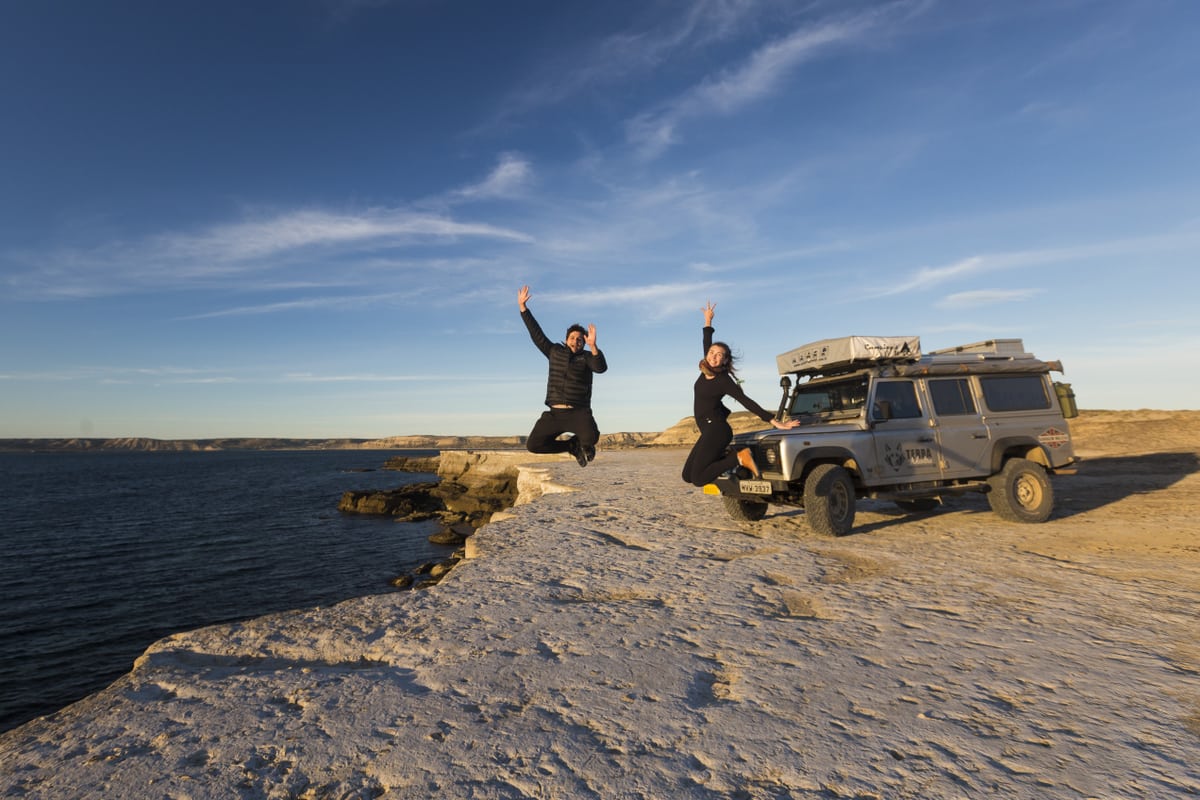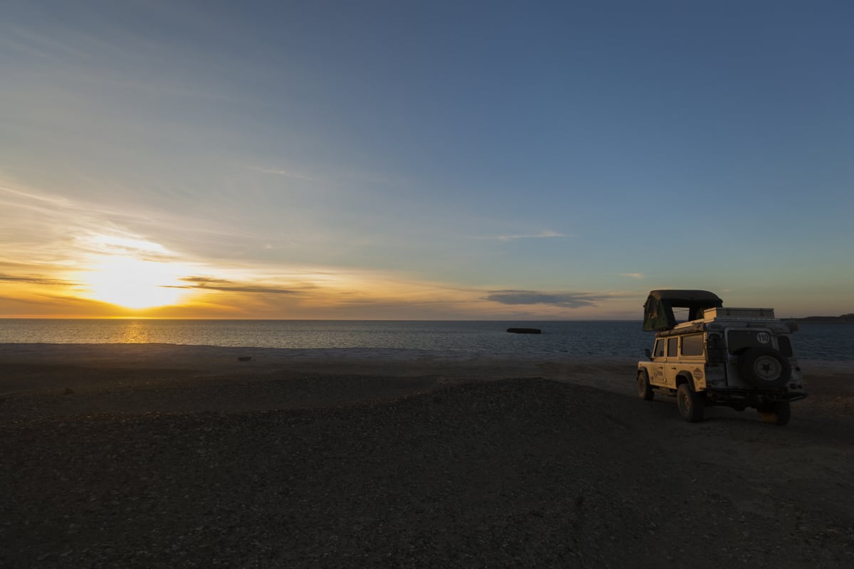 O pôr do sol na Caleta Valdés e na Praia Pardela, onde acampamos, foram cenas tiradas de outro mundo ou de filmes de ficção científica. Nesta última, passamos a noite sozinhos, dormindo em frente ao mar e sentindo a forte ventania que chacoalhava o nosso carro durante a noite.